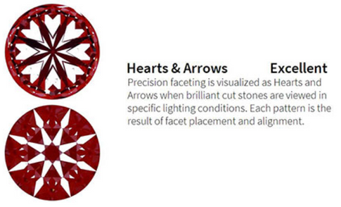 In every industry, there are standout products that become iconic. Hearts and Arrows diamonds hold this esteemed status within the diamond industry. Hearts and Arrows, or H&A, refer to distinct patterns visible in flawlessly faceted round brilliant cut diamonds. A meticulously cut round brilliant diamond showcases a pattern of 8 arrows on the crown (top) side, and a pattern of 8 hearts on the pavilion (bottom) side. When investing in a high-quality precision-cut diamond with Hearts and Arrows, it's essential to examine the diamond yourself using a viewer or request an optical Brilliance light supplement report. Generic sample H&A images may not accurately represent the diamond's true brilliance and symmetry.