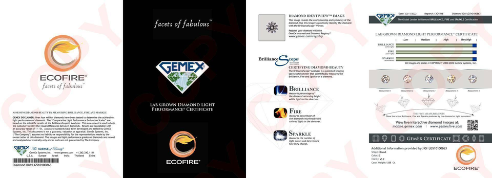 1. ECOFIRE® Sweethearts boasts GCAL certificates with Tripple Excellent (3EX) external symmetry, polish, and proportion, accompanied by extra 2 features for optical brilliance and precision cuts in Hearts and Arrows symmetry (2EX) completing the 5 Excellent categories. Alternatively, opt for ECOFIRE® Sweetheart Diamond by STARVINCI® with supplementary light performance analysis. Choose certification by GIA with AGS ideal light performance or IGI with GemEx® Very High (VH) light performance report.